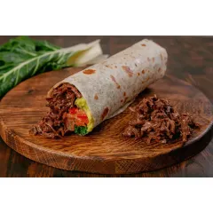טורטיה עבודת יד במילוי "בשר" מפורק במרינדה עם ממרחים וסלטים לבחירתכם. כן נו אני טבעוני וגאה בזה.