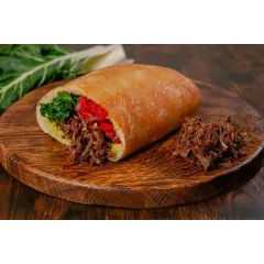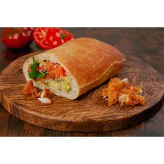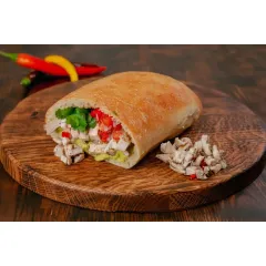 ג'אבטה חמימה במילוי עוף קצוץ ומתובל בתבלין הסודי עם ממרחים וסלטים לבחירתכם